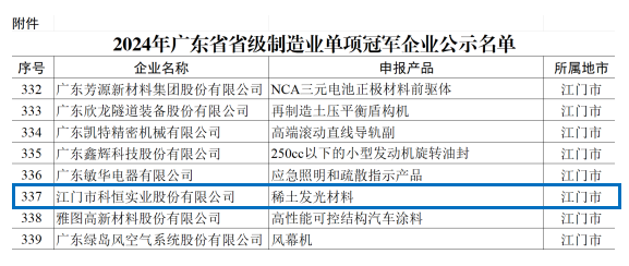 2024年7月,科恒股份获广东省制造业单项冠军企业。
